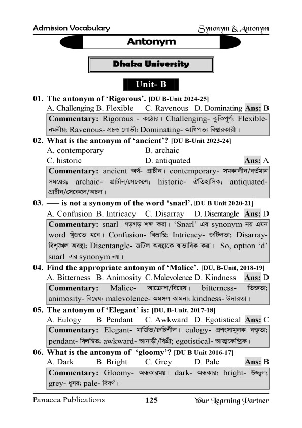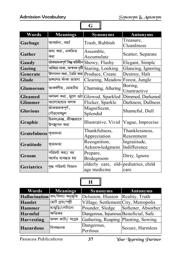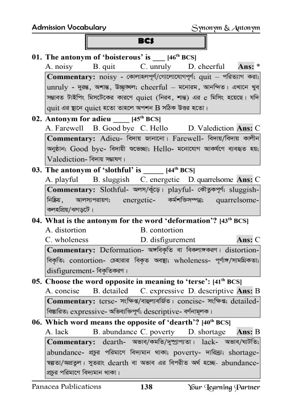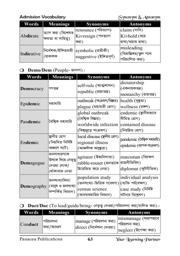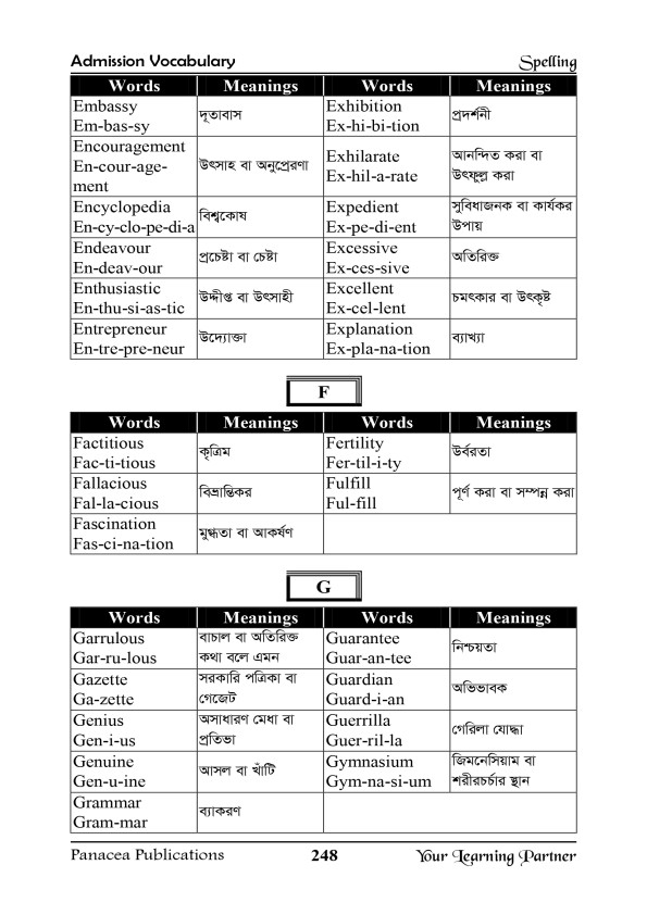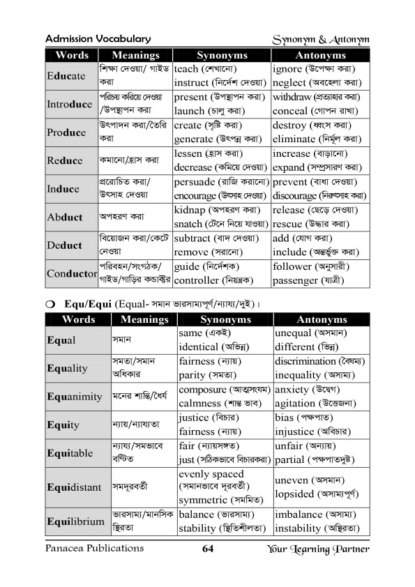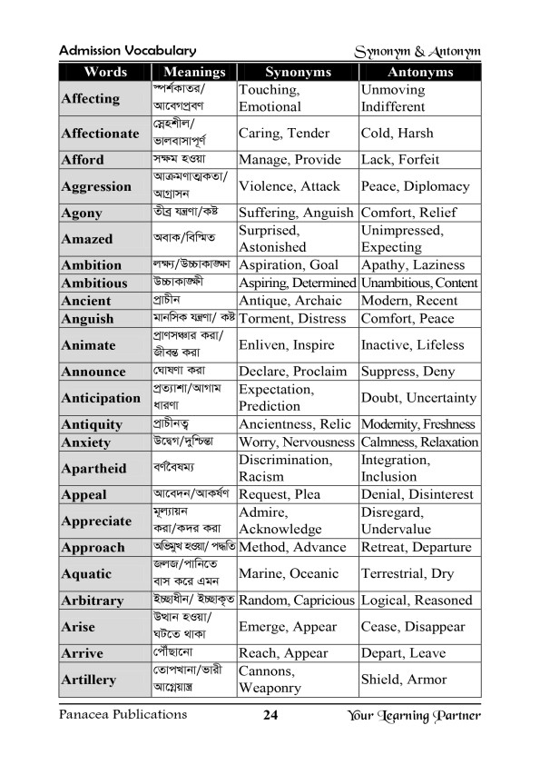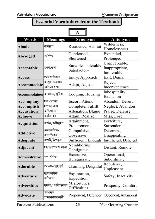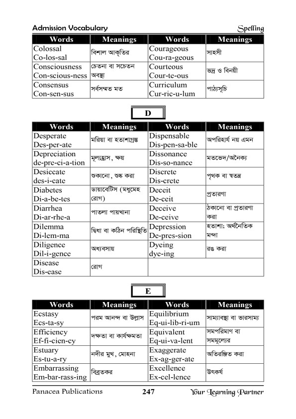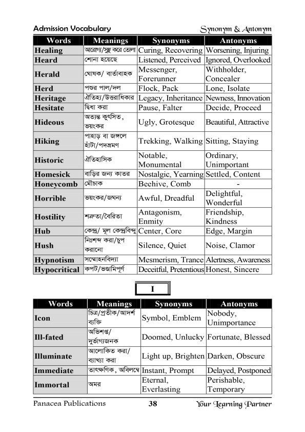 অতি অল্প সময় Vocabulary তে ভালো করতে প্যানাসিয়া পালিকেশন্স এর Vocabulary প্যানাসিয়া বইটি আপনাকে সাহায্য করবে। প্রতিটি বিষয় ধারাবাহিক, সুশৃঙ্খল ও প্রায় নিভুল ভাবে উপস্থাপন করা হয়েছে। যার ফলে প্রতিটি Vocabulary সহজে মানে রাখতে পারবেন। Vocabulary র মত কঠিন বিষয় সহজে আয়ত্ব করতে আজই সংগ্রহ করুন Vocabulary Panacea বইটি ।